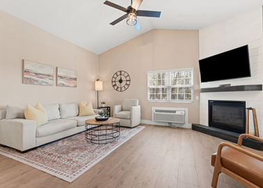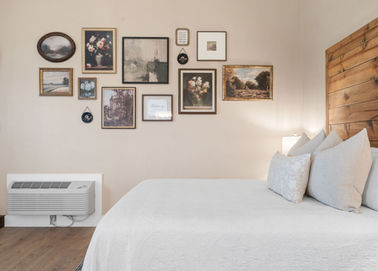 Sadie's Cottage at Sunset Hills Cottages is a studio layout. Indoors, you’ll discover modern/rustic in-suite decor, as well as amenity offerings such as a queen-sized bed, a 55" HD smart TV, high-speed internet and a kitchenette including a mini-fridge/freezer, microwave and a Keurig coffee maker. On the back porch you will find your very own private hot tub & propane fire pit, illuminated by string lights to create the ultimate relaxation space. Sadie's Cottage is just steps away from our beautiful swimming pond that features an infinity edge and multiple cascading waterfalls.